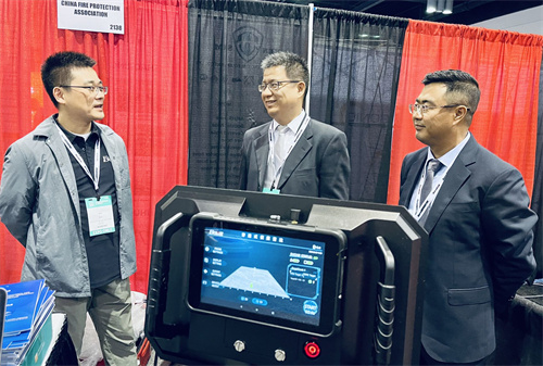 在随后的会展过程中,参团人员依托美国消防协会为协会免费提供的标准展位并主动出击,开展了消防新产品推介、技术交流和经贸洽谈活动。付东风同志重点向观众介绍了中国消防展的情况,进行了展会招展和推介。单位会员北京朗森基科技发展有限公司摆放在展位上的生命探测仪及红外热成像仪样品吸引了很多关注,前来问询和交流的人络绎不绝,并在展会结束时将样品出售,与一家代理公司达成了初步合作意向。单位会员河南良大消防公司的消防水炮产品也引起了关注。其他企业在参观过程中,也都发现了一些颇具创新性的消防产品,对其未来的产品研发或工程项目施工有所启发。