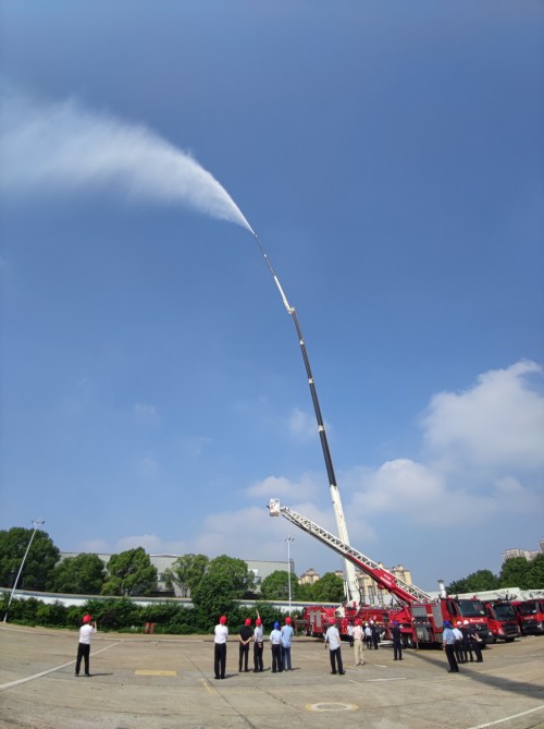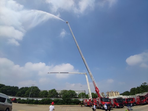 专家组首先听取了成果介绍,对产品进行现场测试,审查技术文件,并进行了技术质询。现场测试过程中,专家组测试了60米云梯消防车和80米举高喷射消防车的举升动作性能和射水性能,充分验证了举高喷射消防车罐供水、外供水、耦合供水等三种供水模式下喷射高度、射程等关键指标参数。